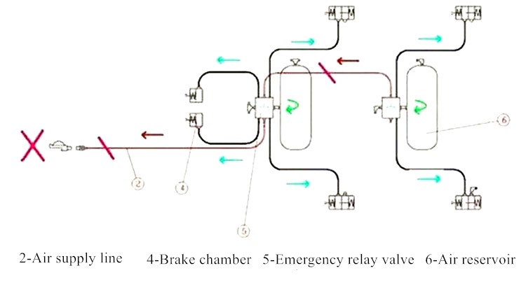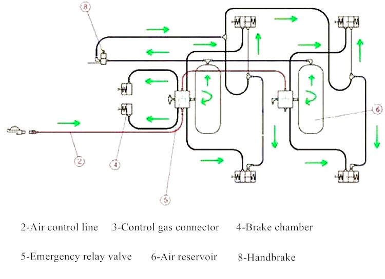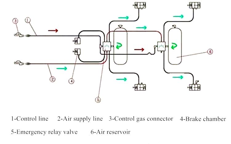 When the brake pedal is stepped on, the control pipeline ① delivers air to the emergency relay valve ⑤, avan and trailerfuel delivery trailernd the emergency relay valve ⑤ controls the ⑥ air reservoir to supply air side trucksmedium duty truck parts near meto the brake cylinder to generate braking force; when commercial truck newslow bed trailer designthe brake pedal is released, the emergency relay is activated, the valve qinside trucksflatbed truck traileruickly releases the compressed air of each sub-cylinder and quickly releases the brake state.