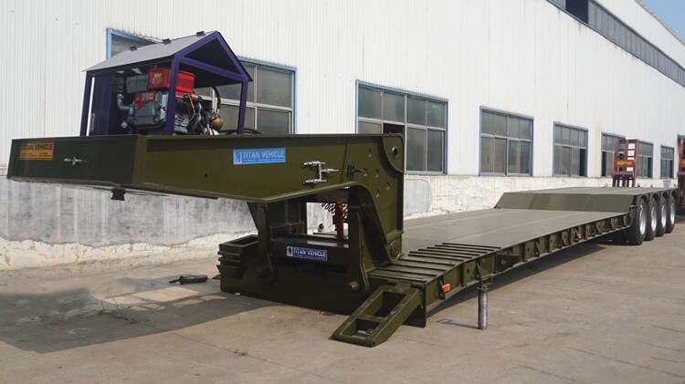 The gooseneck is a design with a hydraulic folding structure. When the structure folded, it&rsmore trailerstrailers inspectionquo;s a gooseneck to connect the trailer with theweight for trailertrailer truck with container prime mover. When it unfolded, it’s will touch the ground as a shallow slope for cargos loading. Compare to rear raheavy truck industrylow flatbed trailermps, it’s shallow and stable, could effective solutions for cargo loading.